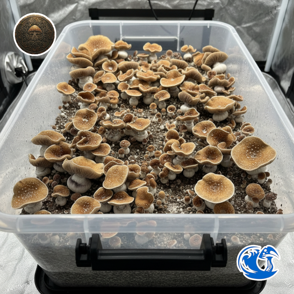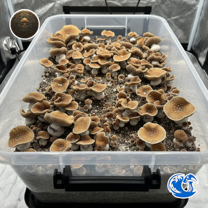 Super Strain Koh Samui (SSKS) traces back to the island of Koh Samui in Thailand, where the original Koh Samui strain was first collected. This “super strain” version was stabilized from especially vigorous specimens, giving it a reputation for fast, assertive growth and thick, resilient fruits. The mushrooms themselves are compact but muscular, with caps that open wide into a deep golden brown, often carrying a darker center that fades toward lighter edges. The stems are stout and pale, built more like pillars than threads, giving the whole fruit a solid, weighty look. Under the microscope, its spores show dense, lively structures that mirror the energy seen in the fruits. SSKS feels like a tropical strain through and through—robust, sun-drenched, and unmistakably Southeast Asian in character.